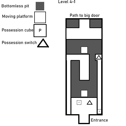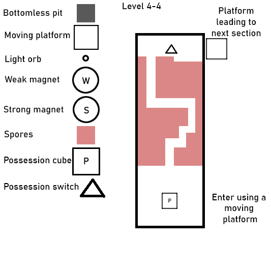 Level four is the final level of the game and serves as the final test of the game’s mechanics and introduces the possession cube. I designed an initial puzzle that isolates the mechanic to ensure clarity before expanding it into a more complex sequence that temporarily shifts the game into a 2D platforming perspective. The final area repurposes a large blockout created earlier in development, allowing multiple designers to collaborate on a climactic space that tests all core systems. This final section includes more complex versions of previous puzzles, such as navigating using magnet spheres, possession cubes and creating paths by activating platforms in the correct order.