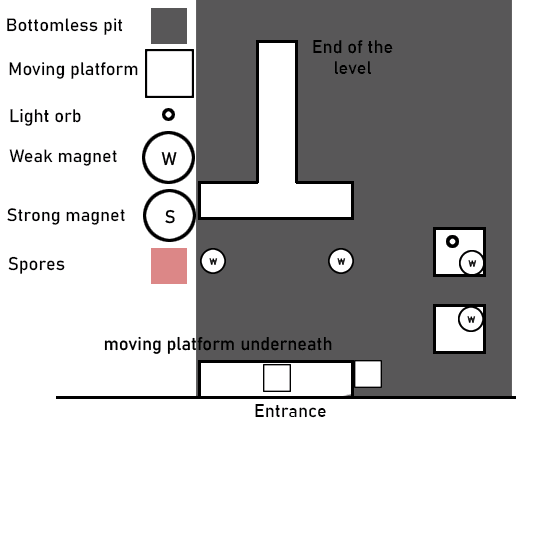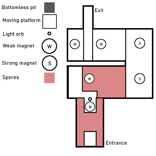 In the third level we introduce the magnet spheres. The opening room presents a simple, low risk scenario that allows players to understand the pull mechanic before introducing spores and weaker magnets. As the level progresses, mechanics are combined to require intentional recall timing and spatial awareness, culminating in a puzzle that demands the player apply everything they have learned so far.